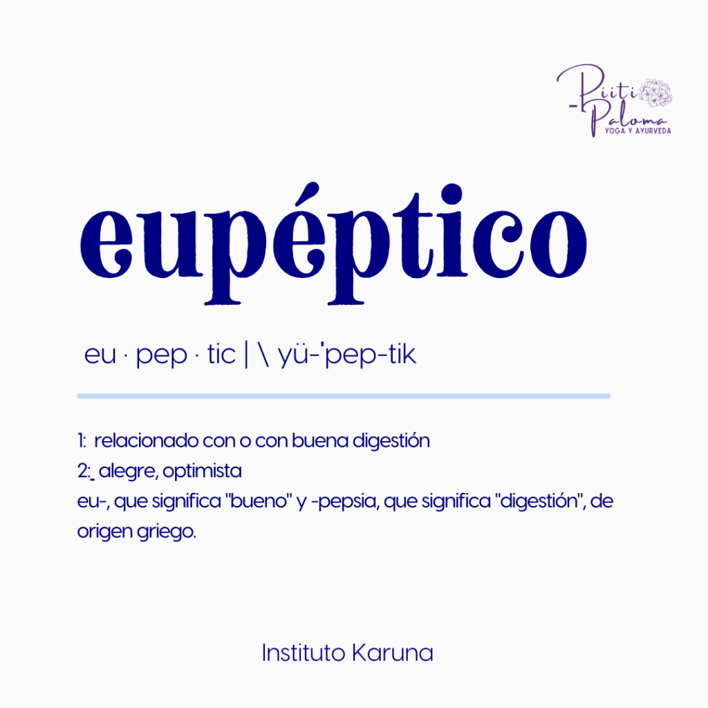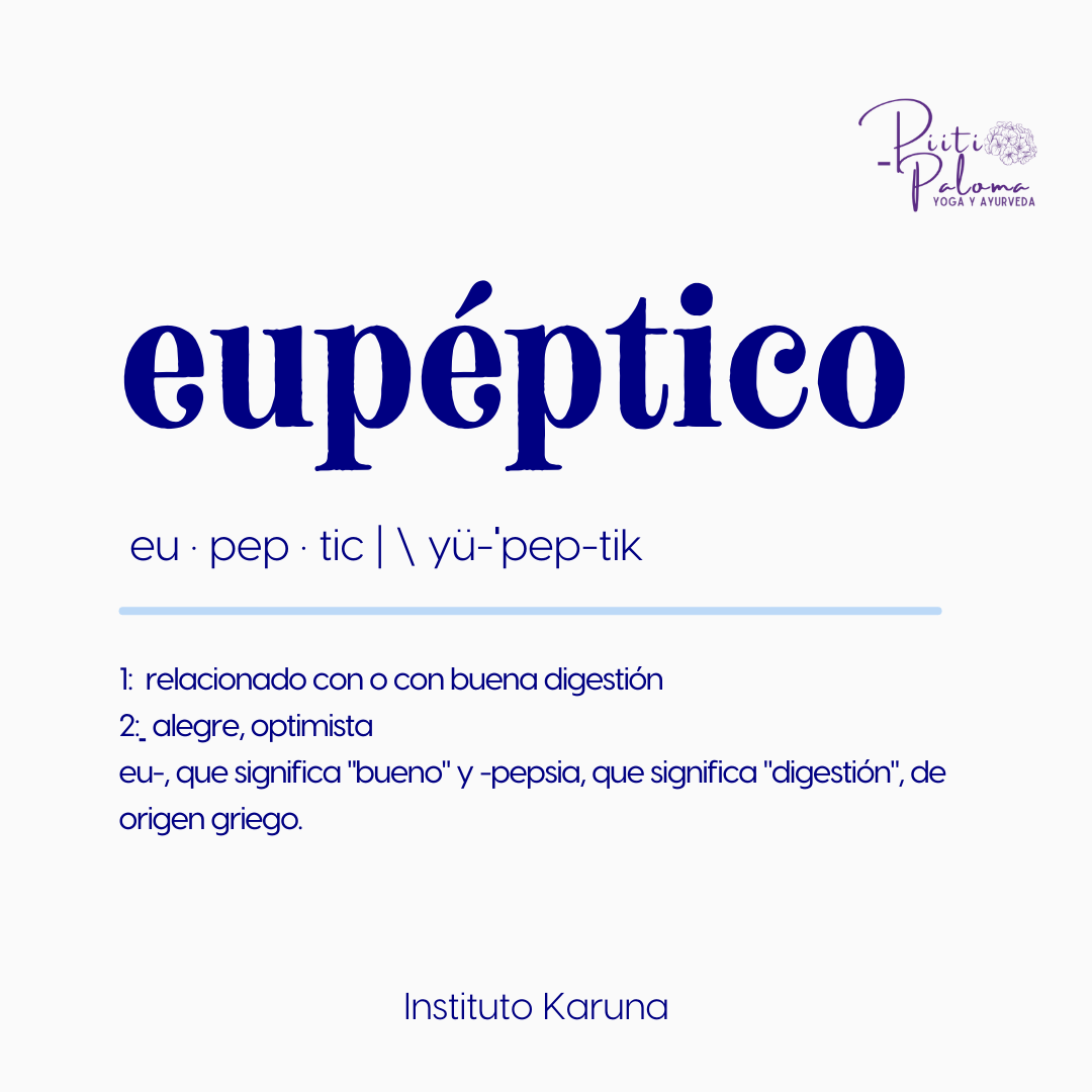 Eupéptico, significa tener una buena digestión y estar contento y optimista. Esta palabra que tiene raíces griegas y que “eu” significa alegre o contento “péptico” que viene de “pepsia” significa que es digerible.